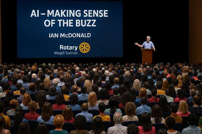 Guest speaker Ian McDonald delivered a lively, humorous and highly relatable presentation to the Magill Rotary Club and the Athelstone-Rostrevor Lions Club entitled “AI – Making Sense of the Buzz.” RCMS Bulletin 1306